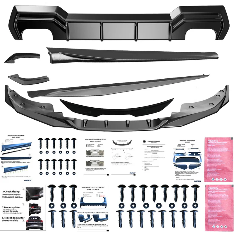 De set bestaat uit: voorspoiler, achterspoiler, sideskirts, diffuser, achtersplitters
